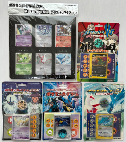 This lot bundles several Japanese theater-exclusive Pokémon TCG products spanning multiple movie releases. Includes the Latios/Latias VS Pack (Pokémon Heroes), Rocket's Tyranitar pack (Celebi: Voice of the Forest), Jirachi Wish Maker pack, and the 10th Anniversary Movie Premium Sheet. These were only available at Japanese cinemas, making sealed copies increasingly scarce.
